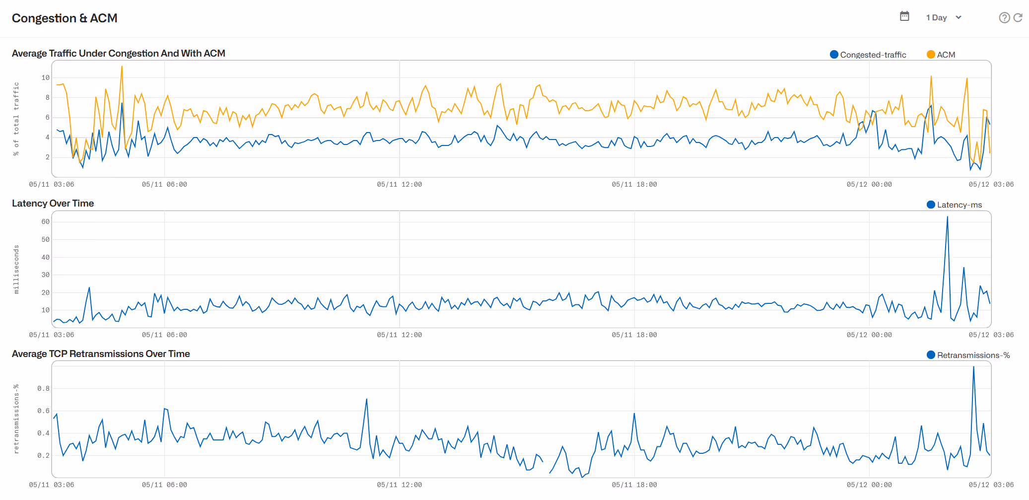 - Tráfico mediobajo congestión y con ACM muestra el % de tráfico en el que ACM detecta congestión, junto con el % de tráfico en el que ACM está mitigando activamente la congestión.